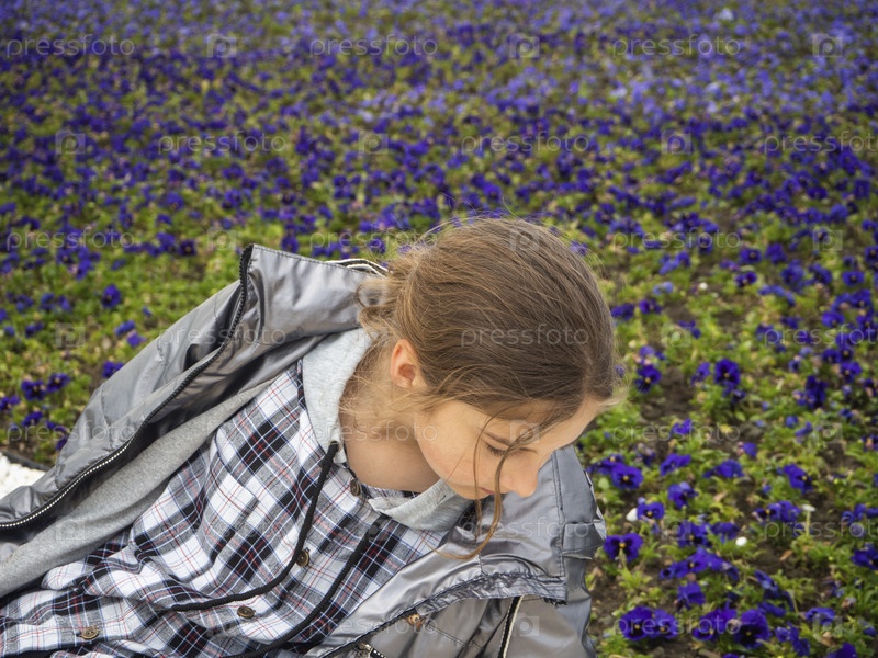 Девочка-подросток на лужайке с фиолетовыми цветами в парке. Девушка и весенний цветок. Открытый романтический портрет молодой счастливой и привлекательной девушки в клетчатой толстовке с капюшоном, наслаждающейся беззаботным времяпрепровождением