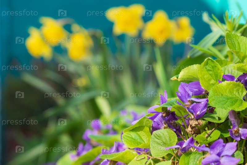 Красивая естественная цветущая поляна фиалок в саду. весенние цветы