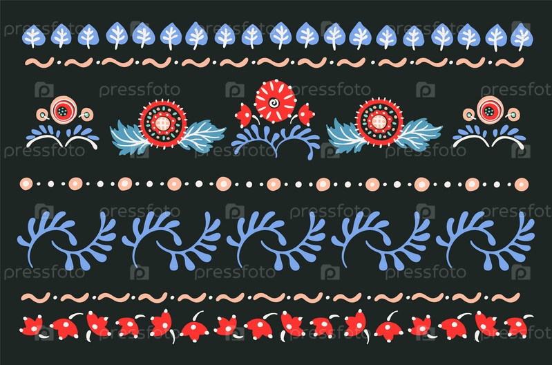 Набор этнических элементов. Бордюр представляет собой полосу с цветами, листьями, ветками, вензелями. Народная вышивка. Славянский, украинский, русский мотив. Хохлома, матрешка, дымковская игрушка. Мексиканский, индийский, цыганский ковер. Вязаное кружево