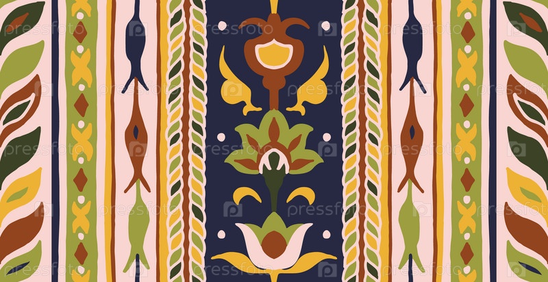 Геометрический дамасский орнамент. Икат границы. Этническая вышивка с листьями и монограммами. Племенная векторная текстура. Бесшовный народный узор в ацтекском стиле. Индийский, скандинавский, цыганский, мексиканский, африканский ковер