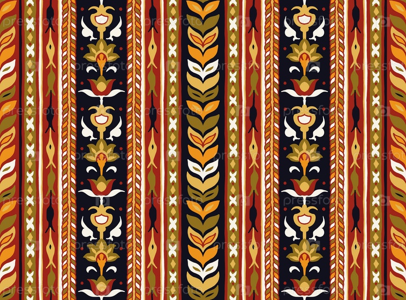 Геометрический дамасский орнамент. Икат границы. Этническая вышивка с листьями и монограммами. Племенная векторная текстура. Бесшовный народный узор в ацтекском стиле. Индийский, скандинавский, цыганский, мексиканский, африканский ковер