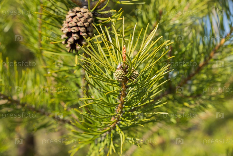 Сосновая шишка на зеленой ветке сосны в лесу