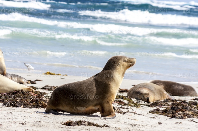 Спящие австралийские морские львы (Neophoca cinerea) на пляже острова Кенгуру, Южная Австралия
