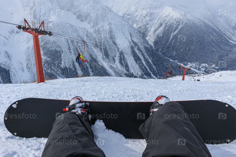 Сноубордист сидит на склоне горнолыжного курорта и смотрит на канатную дорогу. Вид от первого лица: ноги мужчины со сноубордом