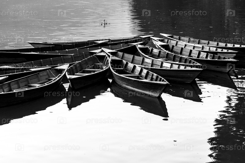Лодки на озере Фева, Покхара, Непал. Черно-белое изображение