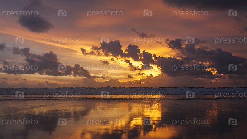 Тропический песчаный пляж Куты на Бали на закате, Индонезия