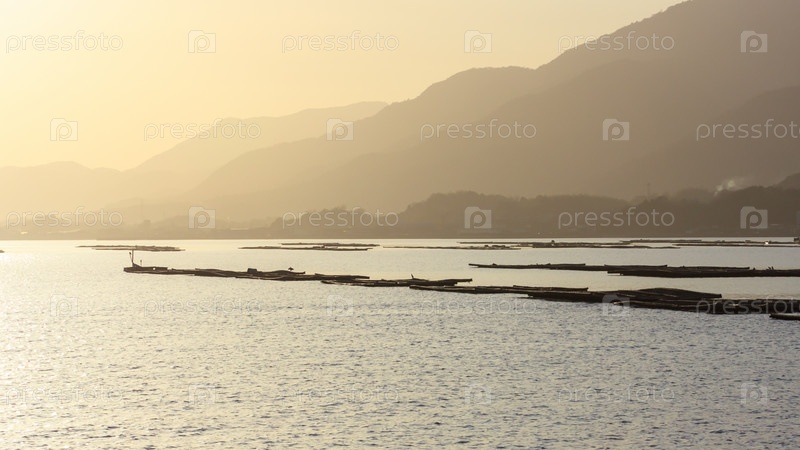 Рыбная ферма рано утром недалеко от острова Миядзима, Япония