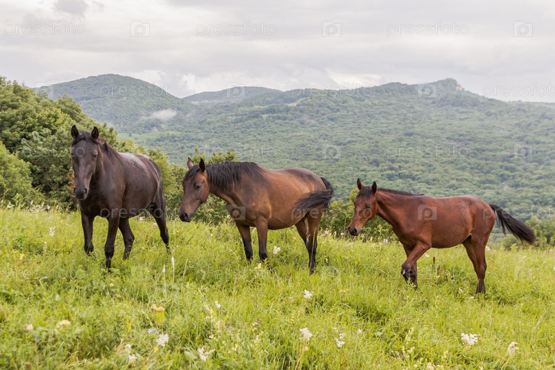 Три лошади на фоне гор, леса и зеленой травы. Концепция животноводства