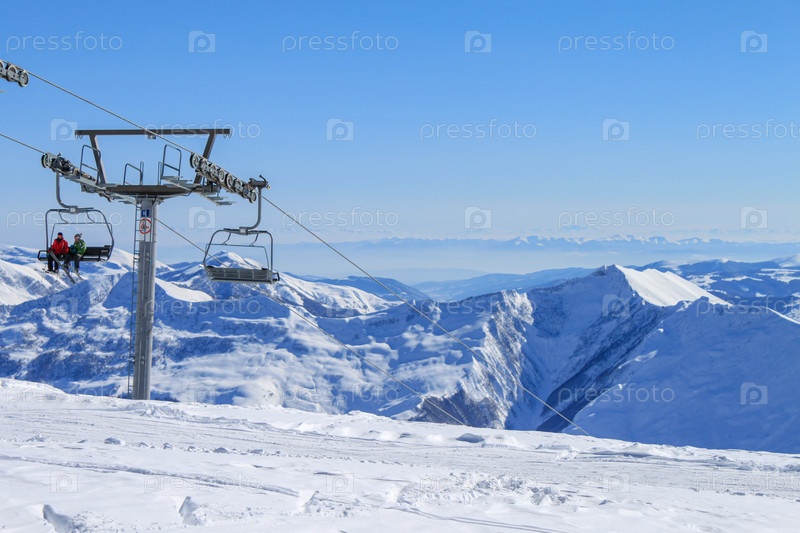 Поддержка кресельного подъемника и лыжников. На фоне снежных хребтов и голубого неба. Концепция активного зимнего отдыха