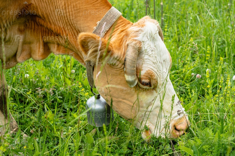 Голова коровы с колокольчиком на шее крупным планом. Животное ест траву на пастбище в горах. Концепция развития крупного рогатого скота
