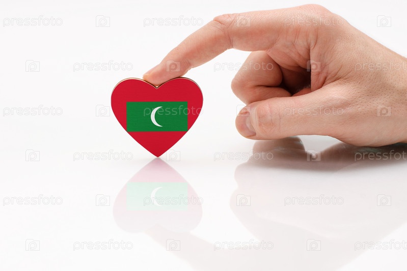 Любите и уважайте Мальдивы. Мужская рука держит сердце в форме флага Мальдивских островов на поверхности белого стекла. Концепция мальдивского патриотизма и гордости