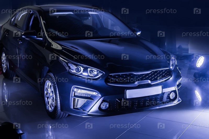 Автомобиль для продажи в выставочном зале, освещенном прожекторами