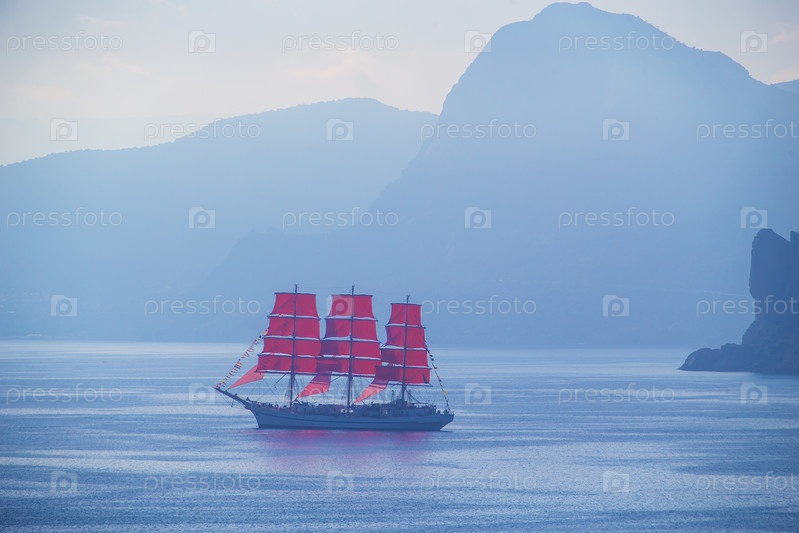 Парусник с красными парусами на море в бухте