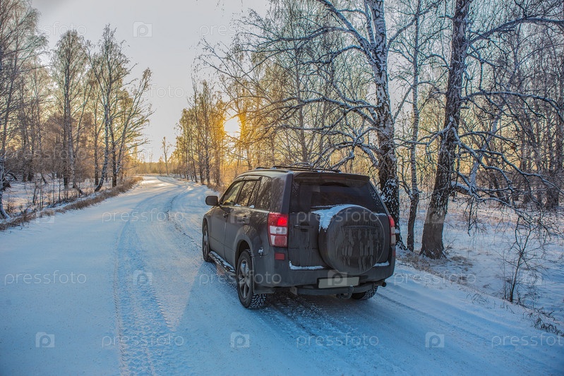 Автомобиль движется по зимней дороге в лесу