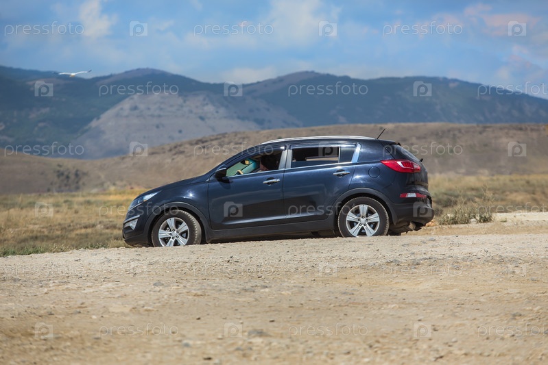 Кроссовер движется по грунтовой дороге в горах