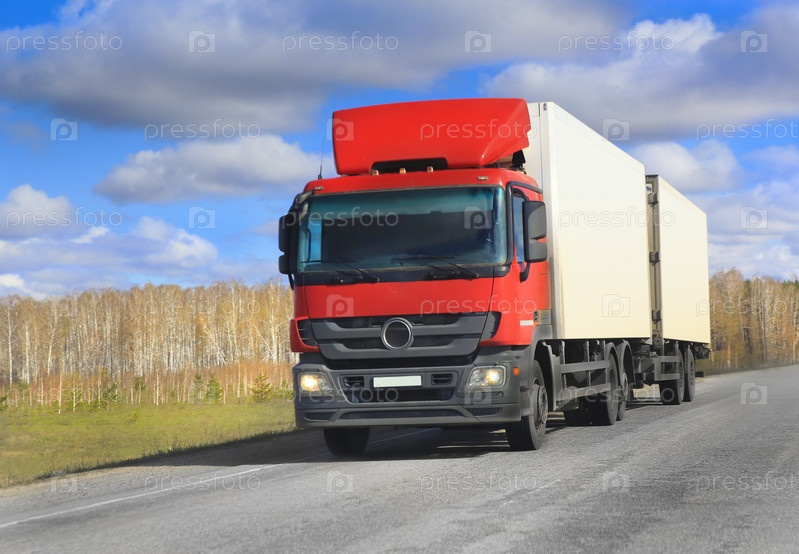 Грузовик с прицепом идет по шоссе