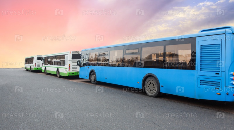 Автобусы подряд на фоне неба на рассвете