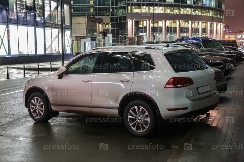 Автомобиль в ночном городе возле витрин