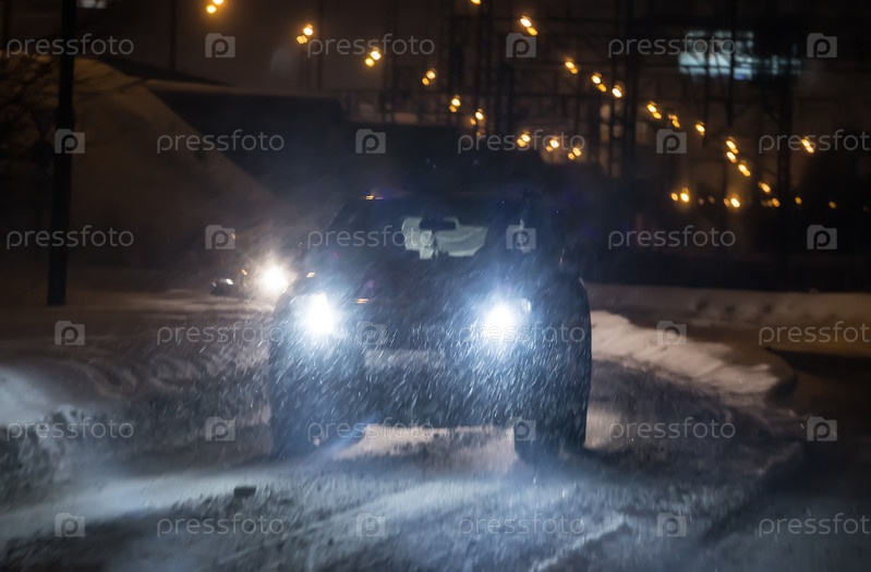 Машины едут по ночной зимней дороге