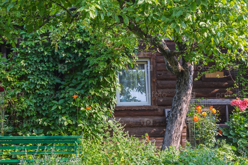 Деревянный дом с цветущим садом