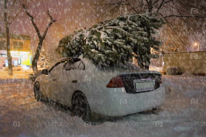 Автомобиль на стоянке с елкой на крыше зимой