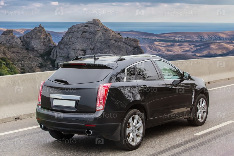 Кроссовер движется по дороге вдоль морского побережья в горы