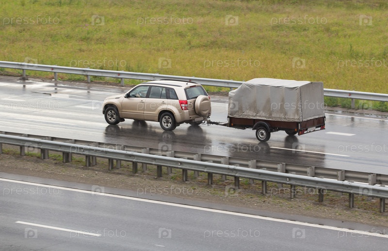 Внедорожник с прицепом движется по шоссе