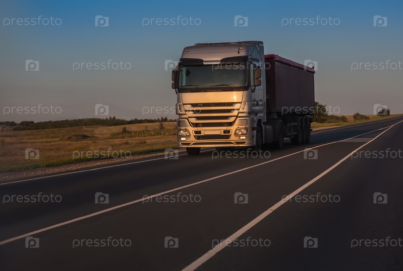Грузовик едет по шоссе на закате