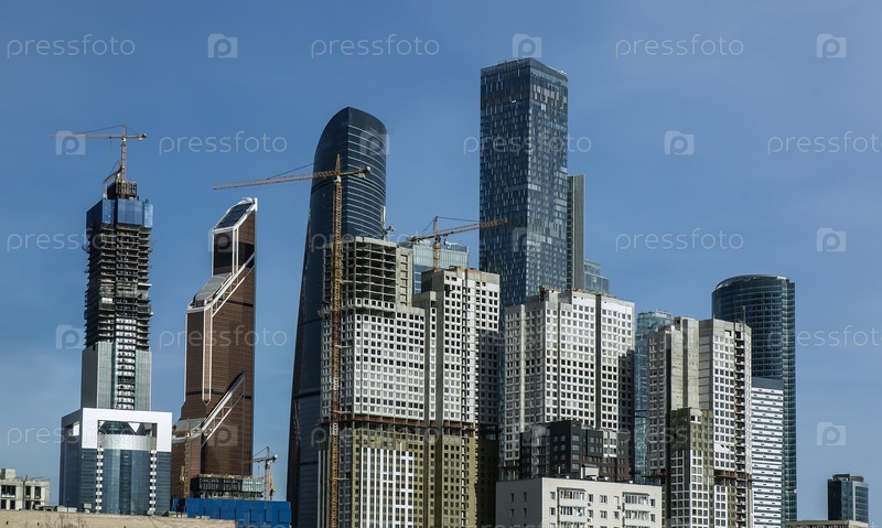 Небоскребы и подъемные краны на фоне голубого неба. Современный город
