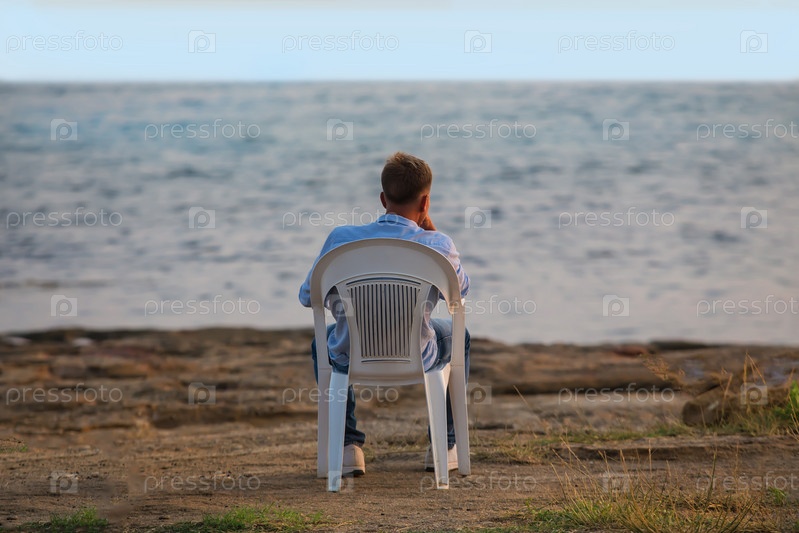 Молодой человек сидит в пластиковом кресле у моря