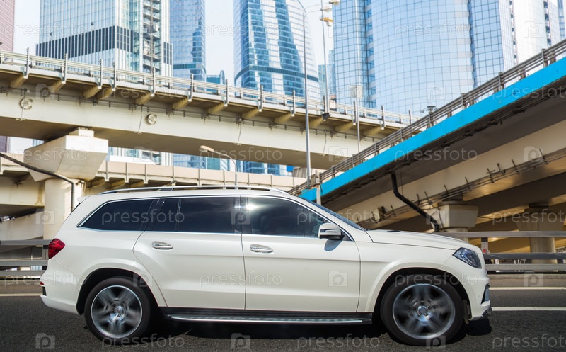 Кроссовер проезжает по автомобильной многоуровневой развязке в городе