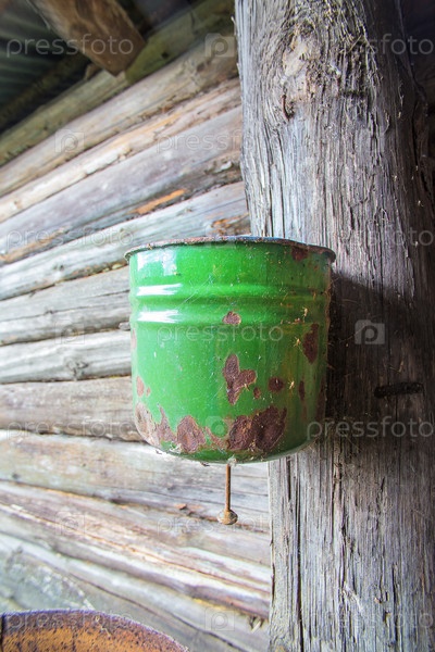 Металлический умывальник на старой деревянной стене