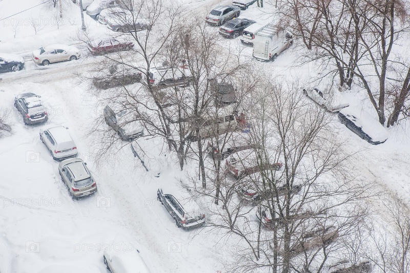 Заснеженные автомобили, припаркованные во дворе жилого района
