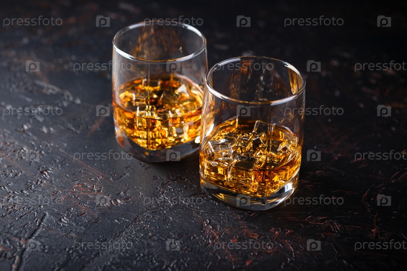 Два стакана виски со льдом на темном фоне с отражением. Алкогольный напиток. Место для текста