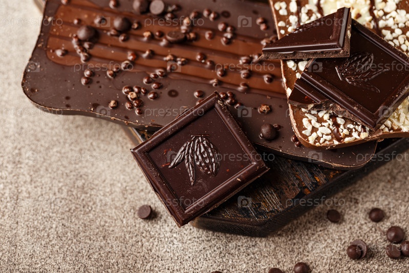 Вид сверху на ломтики темного и молочного шоколада с шоколадной стружкой на коричневом фоне крупным планом