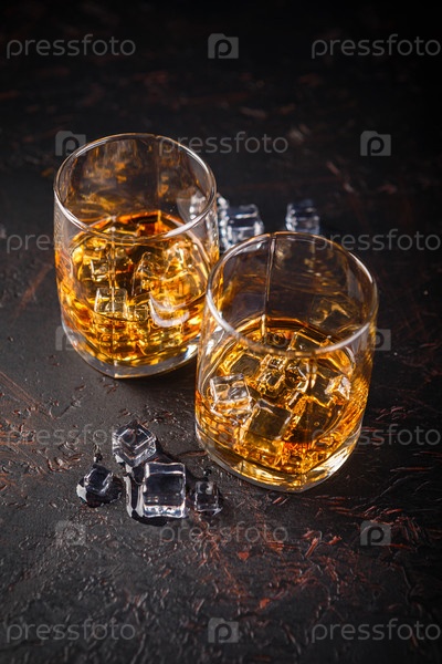 Два стакана виски со льдом на темном фоне с отражением. Алкогольный напиток
