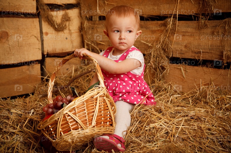 Девочка на соломе с корзиной фруктов в руках
