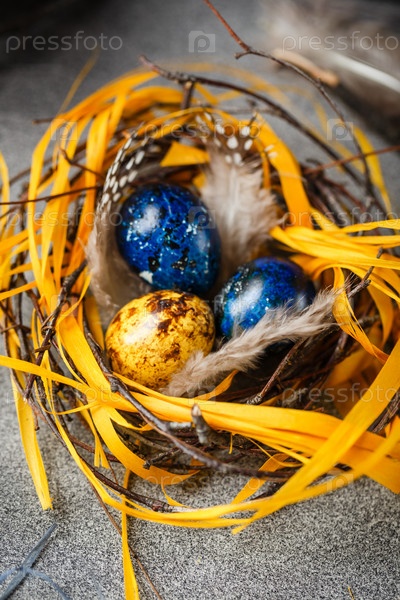 Перепелиные пасхальные яйца с перьями в гнезде на коричневом столе с копией пространства