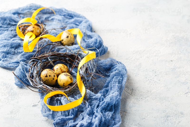 Пасхальные яйца в птичьем гнезде. Перепелиные пасхальные яйца в гнезде на белом столе с копией пространства