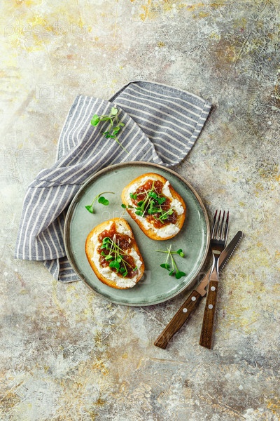 Канапе или кростини с поджаренным багетом, творогом, инжирным джемом