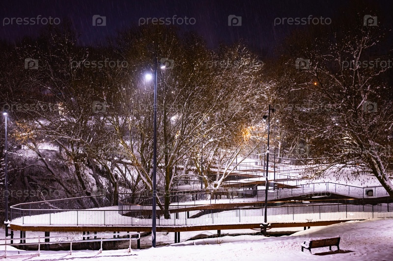 Зимний парк вечером, покрытый снегом, с рядом фонарей