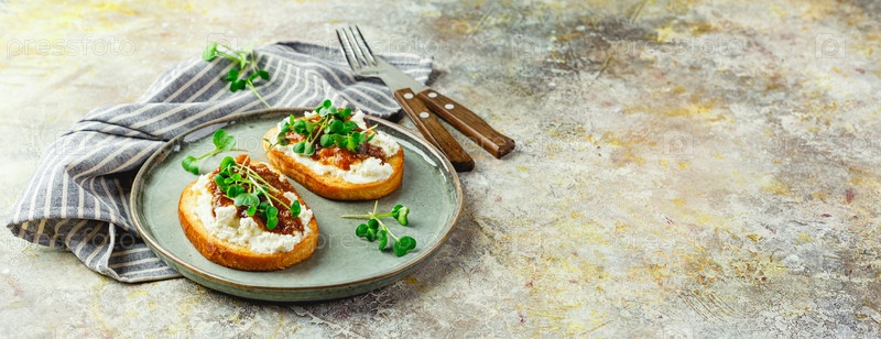Канапе или кростини с поджаренным багетом, творогом, инжирным джемом