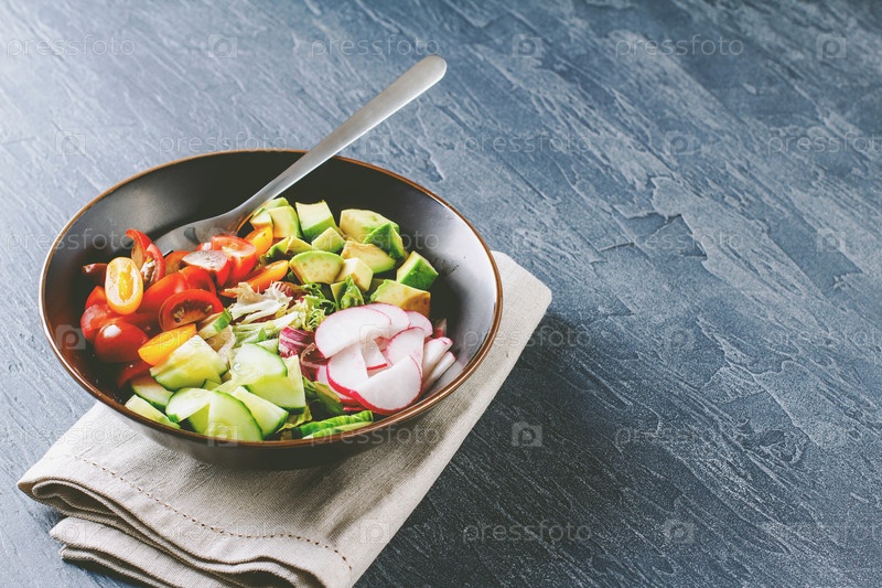 Чаша веганского Будды. Здоровый вегетарианский салат с помидорами черри, огурцом, редисом, авокадо и листьями салата