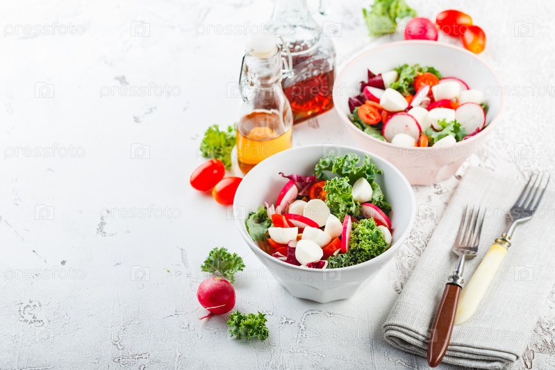 Салат с помидорами черри, редькой и моцареллой, салатный микс