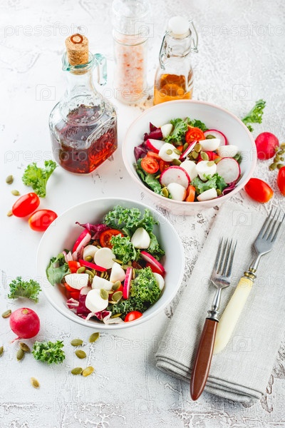 Салат с помидорами черри, редькой и моцареллой, салатный микс