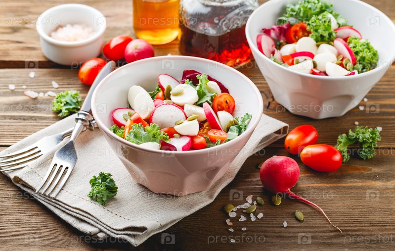 Салат с помидорами черри, редькой и моцареллой, салатный микс