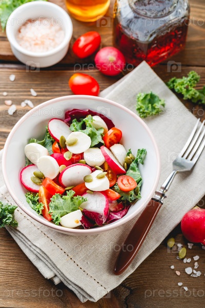 Салат с помидорами черри, редькой и моцареллой, салатный микс