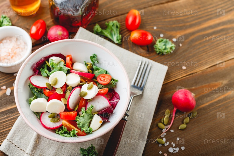 Салат с помидорами черри, редькой и моцареллой, салатный микс