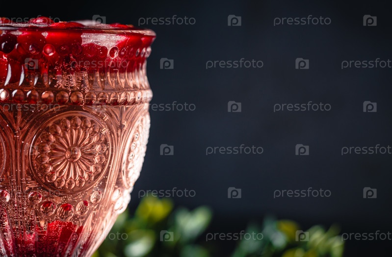 Красная корелла со льдом и клюквой на темном фоне