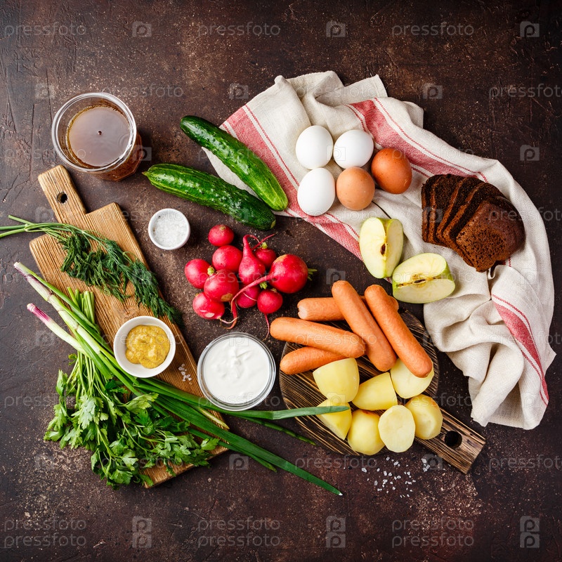 Процесс приготовления окрошки. Измельчение редиски, колбасы и других ингредиентов на деревянной разделочной доске